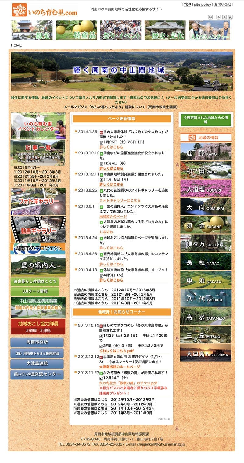 2010年および2011年の2年間、当時中山間地域の振興を推進する[いのち育む里づくり課]のサイト運営のプロポーザルコンペに応募し、周南市の中山間地域のことを隅々まで知りたい気持ちを抑えきれない私は、自分の足で取材して発信するサイトの企画をプレゼンテーションし、業務委託を承りました。