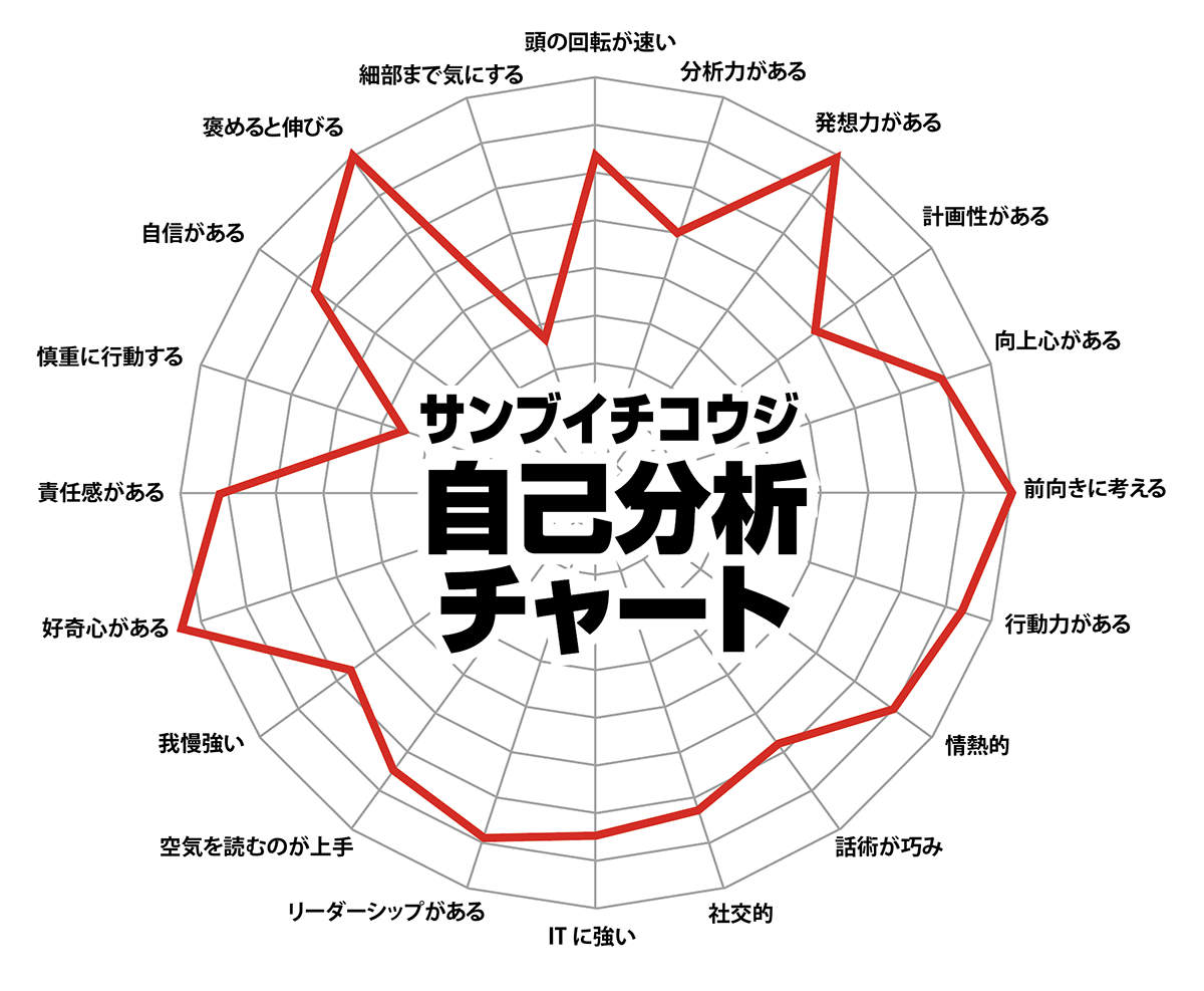 好奇心がある 10点+α | これはもう、MAXレベルも超えたところにあります。自分の言葉で表現するなら、“好奇心が人間離れした男”、もしくは“好奇心の向こう側を求めて”っていう感じです。 ただこれは裏を返すと、好奇心が色々ありすぎて雑念も半端ないので1つのことに集中できない、という弱点なのかも。 |
